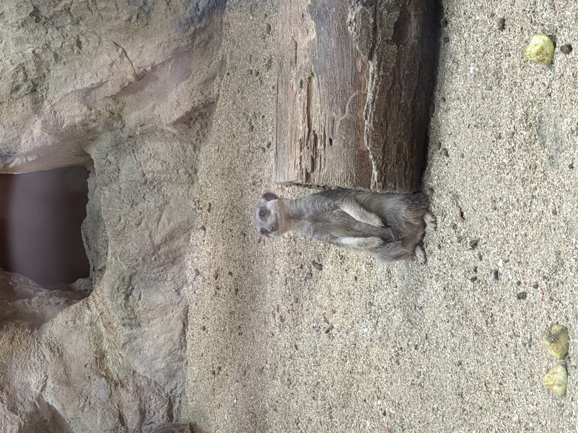 A single meerkat (Suricata suricatta) stands upright on its hind legs in a sandy enclosure at the Sofia Zoo in Sofia, Bulgaria. The animal, predominantly grey-brown with darker markings, faces forward, its front paws held against its chest. To the right of the meerkat, a horizontal weathered wooden log rests on the sand. The background consists of textured, light-brown rock formations, featuring a dark, cave-like opening visible in the upper left quadrant. The ground surface is composed of fine, light-colored sand mixed with small pebbles and scattered dark specks. Three light-colored, irregularly shaped objects, possibly food items, are visible on the sand: two clustered in the bottom left corner and one further to the right in the bottom quadrant. There are no other visible animals or human subjects present.