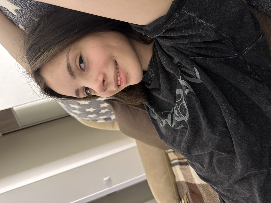 A young female individual is depicted in an indoor residential setting in Novosergievka, Russia, reclining on what appears to be a sofa or armchair. She has dark brown hair, blue eyes, and is smiling towards the camera, displaying both upper and lower teeth, with visible clear aligners on the mandibular arch. Her left arm is elevated, with the hand out of frame. She is attired in a dark grey, textured t-shirt featuring a light-colored graphic print on the chest. The immediate environment includes light brown upholstery on the furniture, a plaid blanket draped on the lower left, and a grey and white star-patterned throw or cushion behind her head. The background consists of light-colored walls, a visible doorway or passage with a wall-mounted switch or outlet, and a light-toned closet or cabinet.