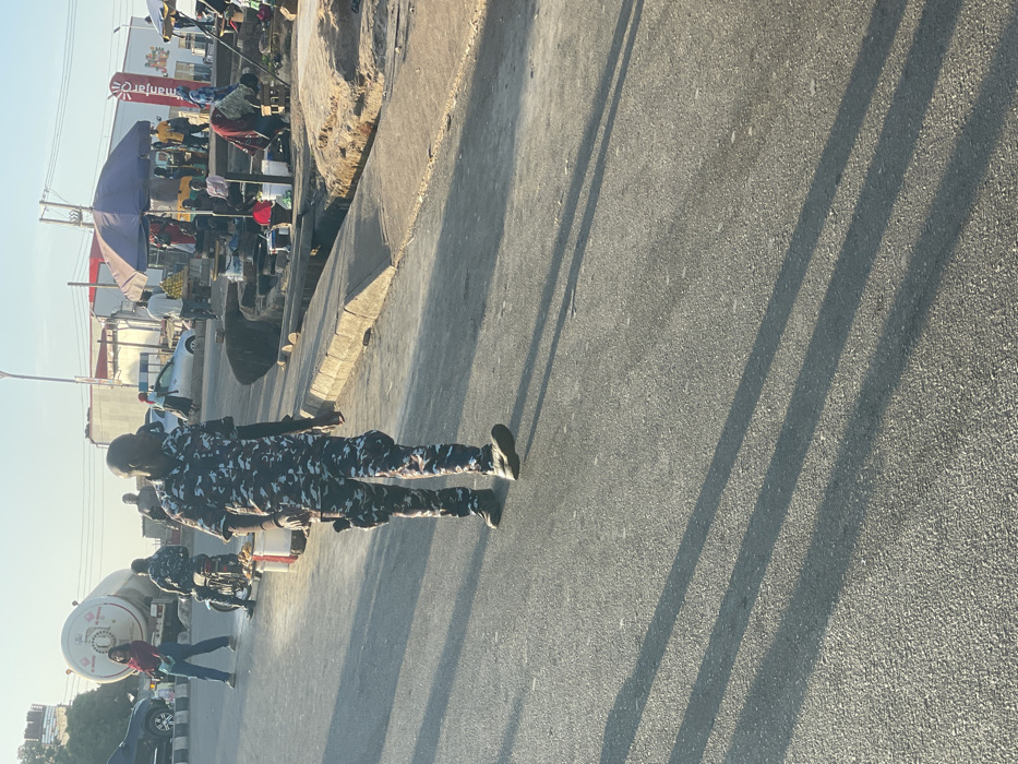 An adult male in a blue and white camouflage uniform, with a dark object holstered on his right hip, walks on an asphalt road in Barakin Lerawi, Nigeria. Long shadows from the subject and other unseen elements stretch across the road. To the left, a woman in a red top and blue jeans walks away from the viewer, partially obscured by a black vehicle. Behind her, a large white tanker truck bearing "SHELL" branding is visible, along with an individual in a similar camouflage uniform seated on a motorcycle. To the right, a concrete curb separates the road from a lower ground level that hosts multiple market stalls. One stall features a blue umbrella, under which fruits and other items are displayed. Several individuals are present in this market area, engaged in commercial activities. The background consists of various buildings, including one with a "Manjaro" sign, additional vehicles, and pedestrians, all under a clear sky.