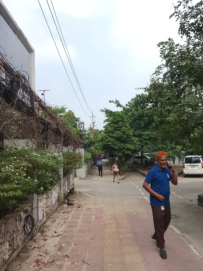 A street scene captures a man walking on a brick-paved sidewalk while talking on a mobile phone. He has vibrant orange hair, a blue polo shirt, and brown pants. In the background, two other men walk along the sidewalk, a white van is parked, and lush trees provide shade. A building with exposed cables and some flowering bushes is on the left. Overhead power lines run across the scene under a cloudy sky.