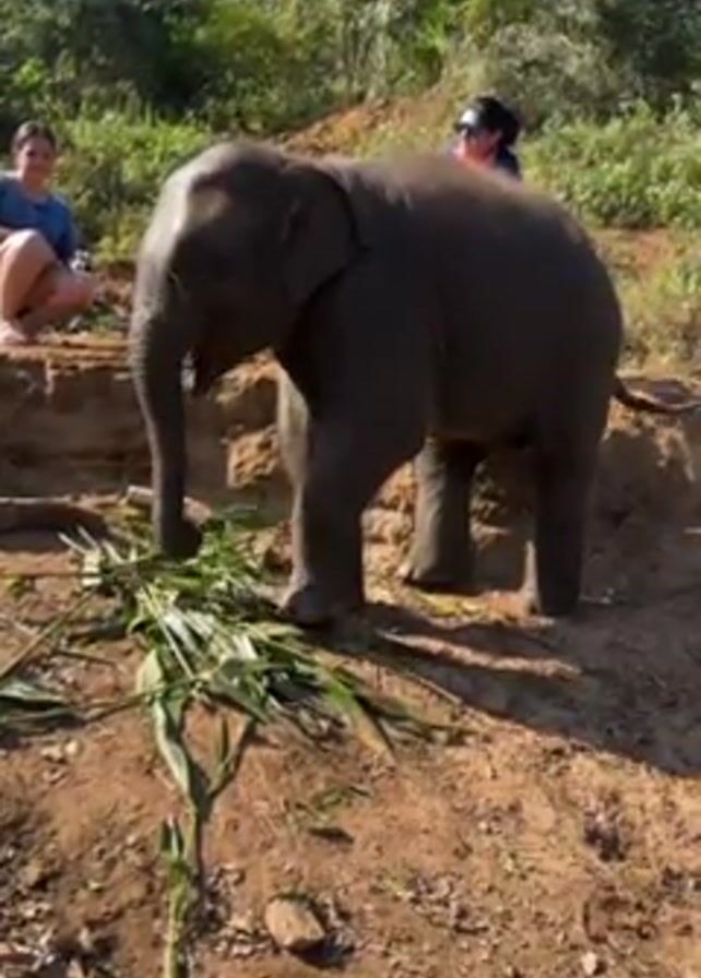 baby elephant standing on a dirt bank, eating leafy green stalks. Two women are visible in the background, sitting or standing on the bank as well. They appear to be observing the elephant. The area is lush with green vegetation and trees, under a clear blue sky. The scene is captured in daylight, casting shadows on the ground.