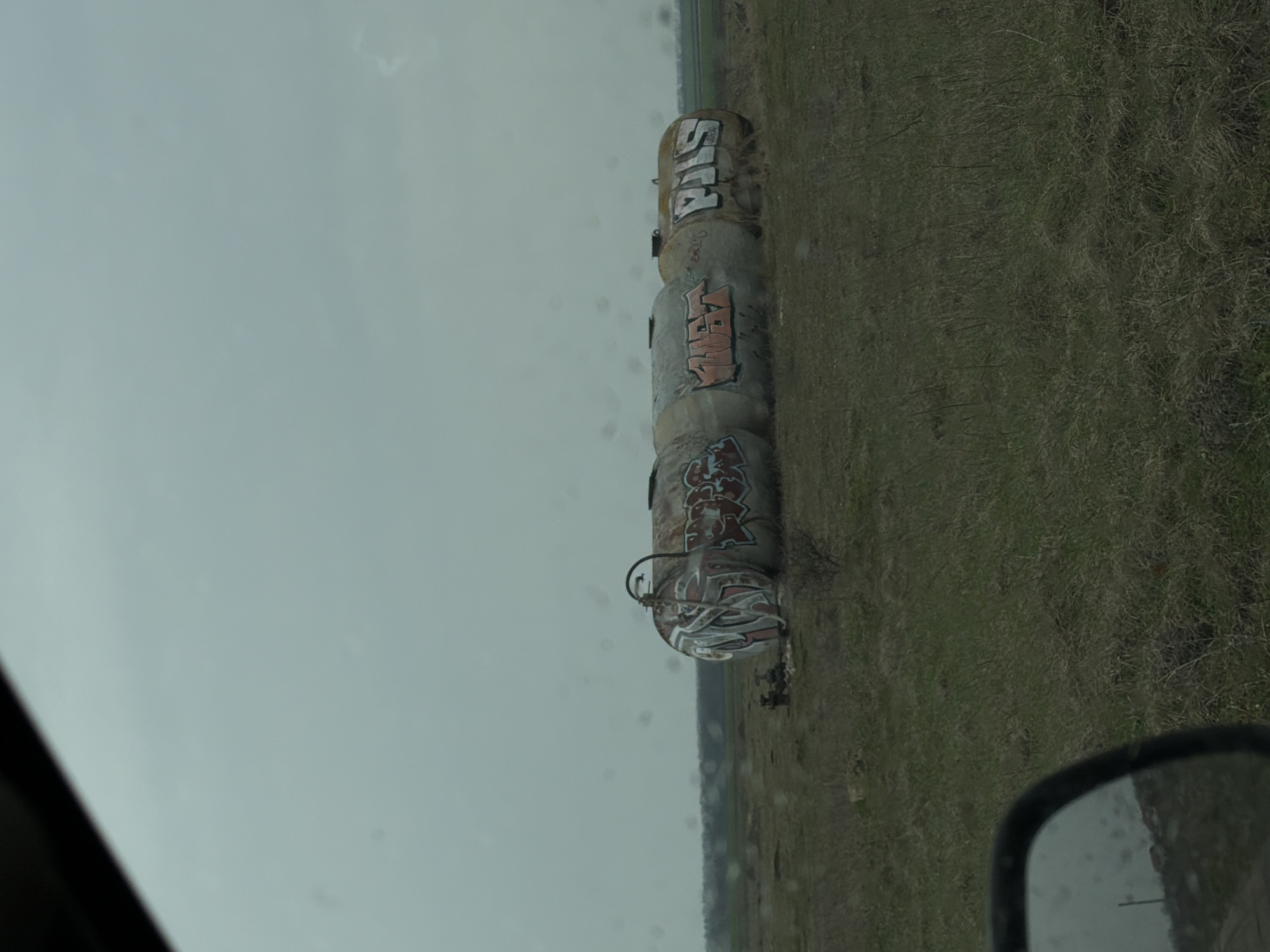 The image presents a landscape view in Tyulenovo, Bulgaria, captured from inside a vehicle, with a partial view of a rearview mirror in the lower-left corner and moisture droplets on the viewing surface. The central focus is an array of at least three horizontally oriented, cylindrical storage tanks, appearing rusted and abandoned, situated in a flat, grassy field. The tanks are extensively covered in graffiti; the leftmost visible tank features complex designs in red, white, and black, along with an attached curved pipe structure and ground-level valves. Subsequent tanks display distinct graffiti tags, including an orange and black "MUZ" and a white and black "PULS". The ground is characterized by sparse, dry, and greener patches of grass, with some small, dry shrubbery. A faint line of distant dark trees or vegetation marks the horizon, beyond which lighter green fields are visible to the right. The sky is uniformly overcast and grey, indicating a dull weather condition. No human figures or active interactions are visible within the scene.