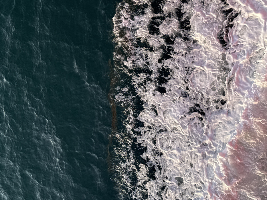 An overhead view captures open water off the coast of Unknown, Greece. The upper segment displays dark blue-green water, characterized by surface ripples. A distinct horizontal boundary separates this from a large volume of turbulent, white foam occupying the lower segment. This foam exhibits varying textures and densities, with localized areas presenting a light pinkish coloration. Indistinct dark matter is observed along the transition zone between the calmer water and the foam. No individuals, vessels, or specific land features are visible. The configuration of the foam indicates a wake generated by a moving watercraft.