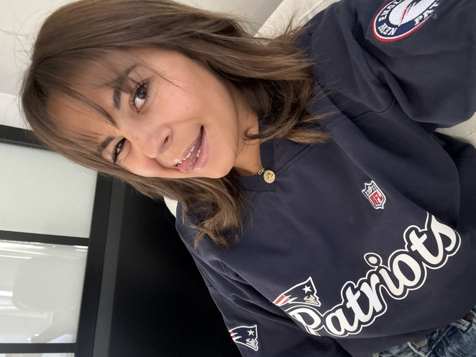 A female subject is presented in a close-up, selfie-style photograph taken indoors in Cannes, France. She has shoulder-length brown hair with bangs, winks her left eye, and extends her tongue slightly. She wears a navy blue long-sleeved shirt adorned with "Patriots" text across the chest, a New England Patriots logo on the left shoulder/upper arm, an NFL shield logo, and a circular New England Patriots patch on the right sleeve. A gold chain with a circular pendant is visible around her neck. A portion of a denim garment is visible in the lower left foreground. The background consists of a dark, solid surface behind her, topped by a white wall section with a horizontal dark frame, and a faint, blurred reflection of a human outline is discernible in the upper left background.
