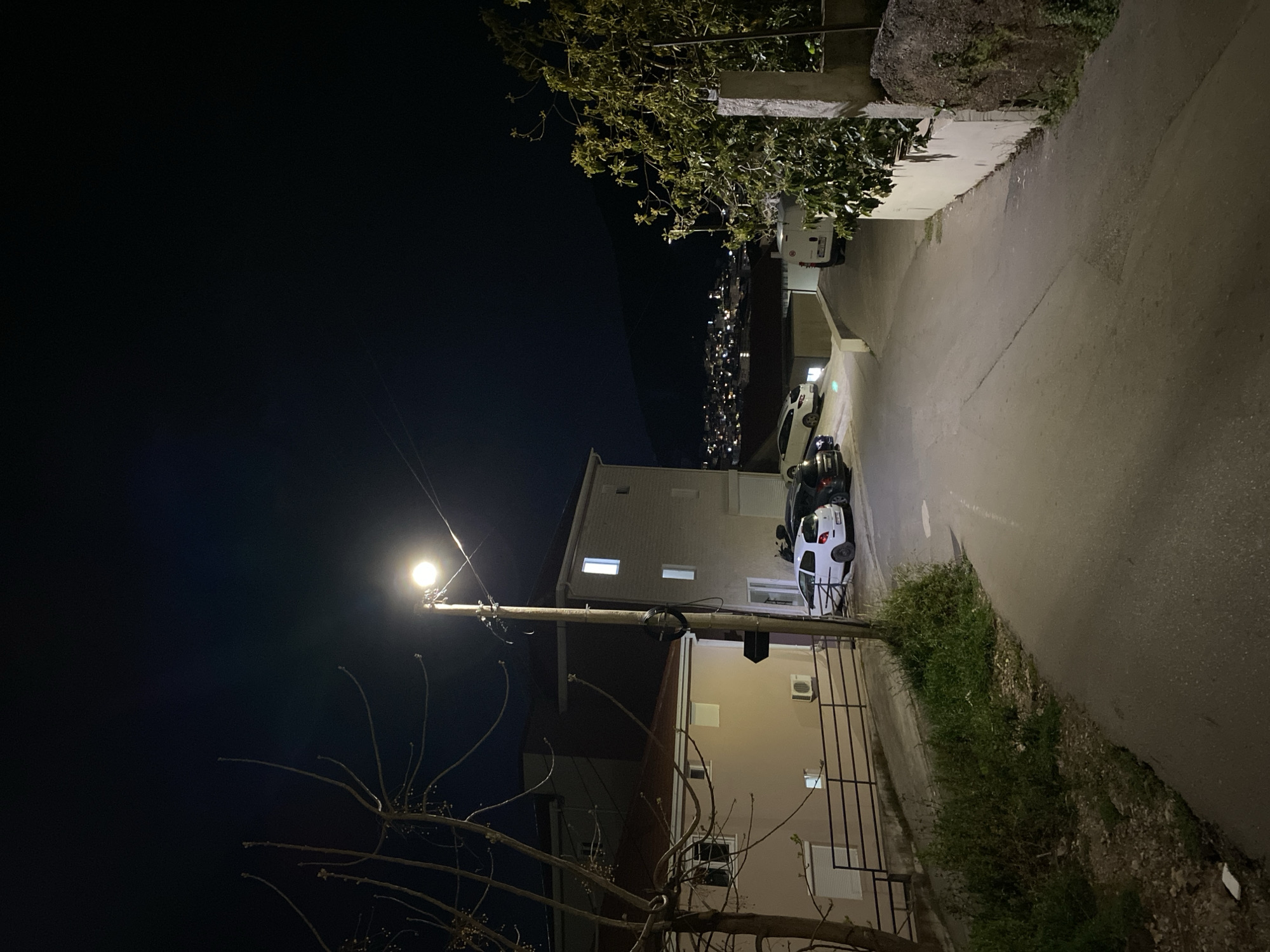 street scene at night in Budva, Montenegro. A streetlight illuminates the foreground. Buildings line the street, with cars parked along the side. In the distance, city lights are visible on a hillside. A tree is present in the lower left corner of the frame. The street appears to be paved and slopes upward. The sky is dark. The scene is stationary, lacking any evident action or movement.