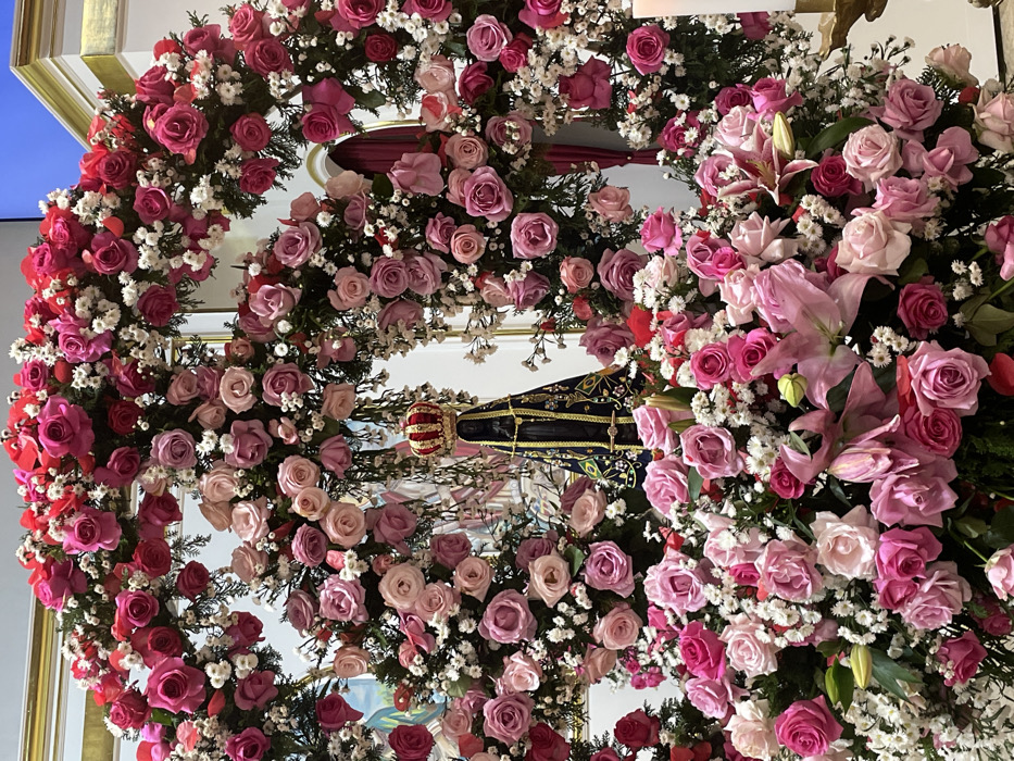 The image displays a religious statue of Nossa Senhora Aparecida, Brazil's patroness, centrally positioned within a large, elaborate floral arrangement