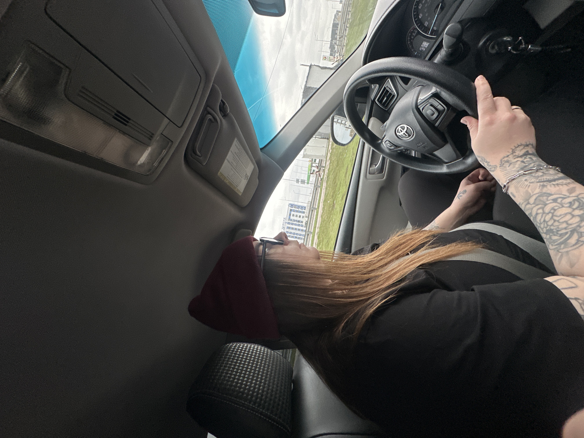 An interior vehicle scene shows a female driver in Kyiv, Ukraine, situated near the Dniprovska Embankment, with the distinctive "Інвар" (INVAR) building visible in the distant background. The driver, exhibiting long reddish-brown hair, wears a maroon knit beanie and dark-rimmed glasses. She is dressed in a black short-sleeved top and black pants, secured by a light grey seatbelt. Visible on her left arm are intricate tattoos, complemented by a silver-colored bracelet on her wrist. Both hands grip a black three-spoke Toyota steering wheel, which displays the brand's logo and integrated controls. Vehicle keys are inserted into the ignition. The car's interior includes a light-colored overhead console with an integrated light fixture and a windshield with a blue-tinted upper band. Outside, under an overcast sky, a wide roadway is flanked by green grassy areas. A gas station canopy is discernible ahead, with additional commercial or industrial structures in the mid-ground. The multi-story "Інвар" building, featuring blue and white accents and Cyrillic text, stands prominently in the far background.