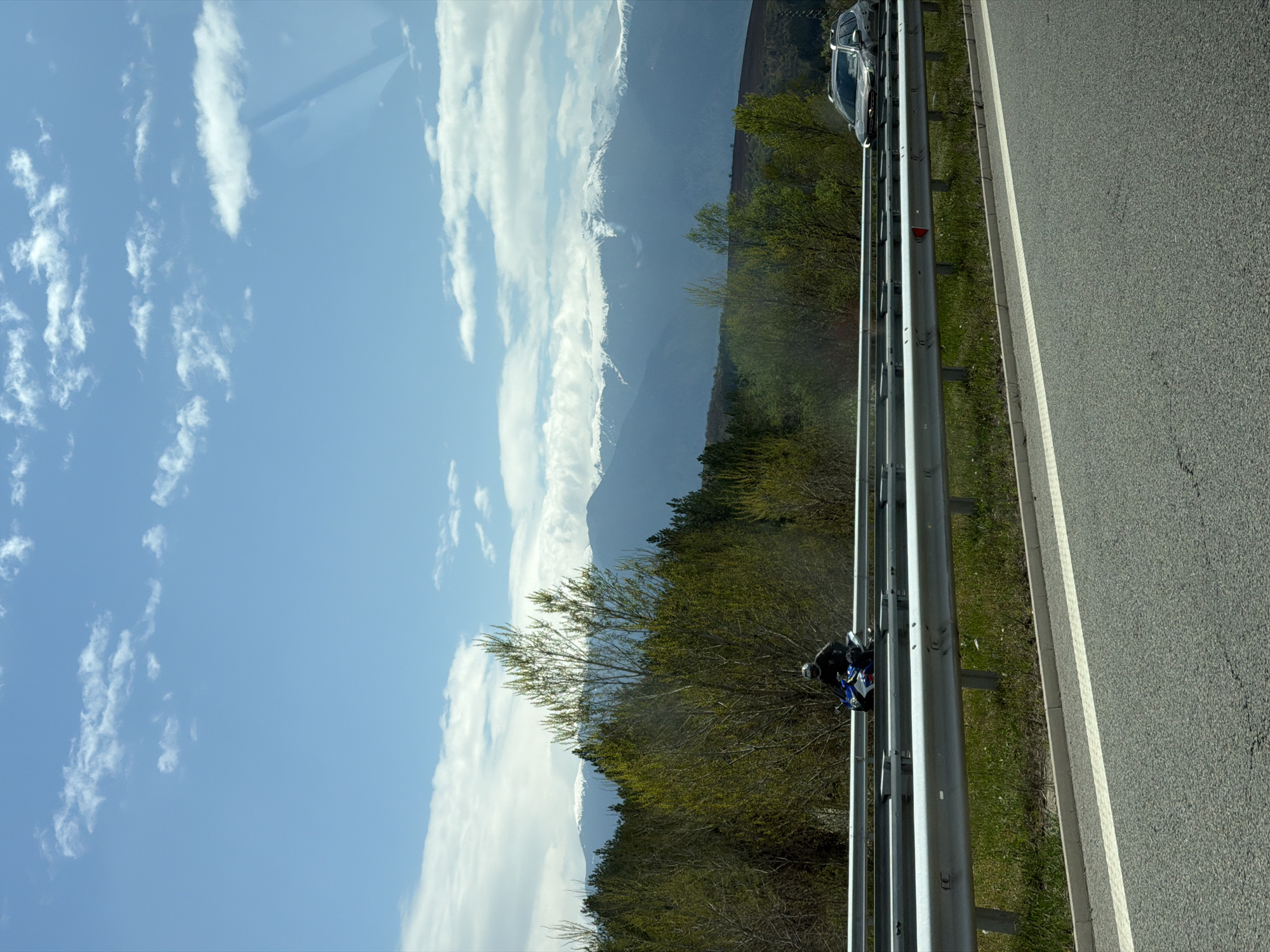 A landscape image taken from a vehicle traveling along a highway in Dyakovo, Bulgaria. The foreground contains a metal guardrail, roadside vegetation, and a gray asphalt highway. A motorcycle rider wearing protective gear is positioned on the roadside next to the guardrail. The midground contains green trees and distant, snow-capped mountains. The sky is blue with scattered white clouds. A silver car is further along the highway.