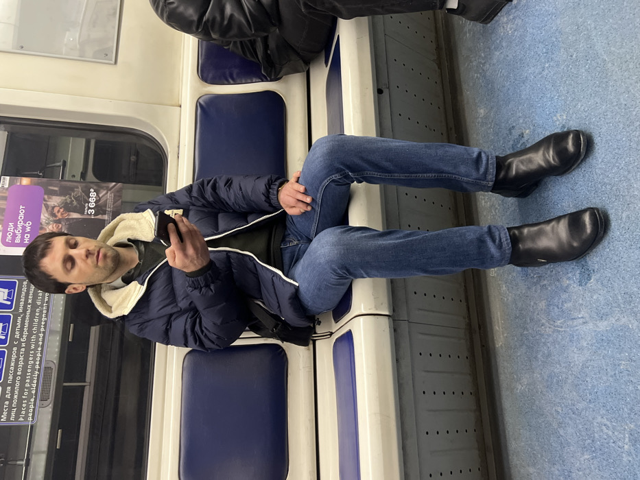 A man in a blue puffer jacket and jeans is sitting on a public transportation seat, looking at his phone. He has black boots on. Another person is sitting on the adjacent seat. A sign in Russian and English for reserved seating for passengers with children, disabilities, elderly people, and pregnant women is visible near the window. An advertisement for "WB" is next to the sign. The seats are dark blue with white and blue trim. The floor is light blue.