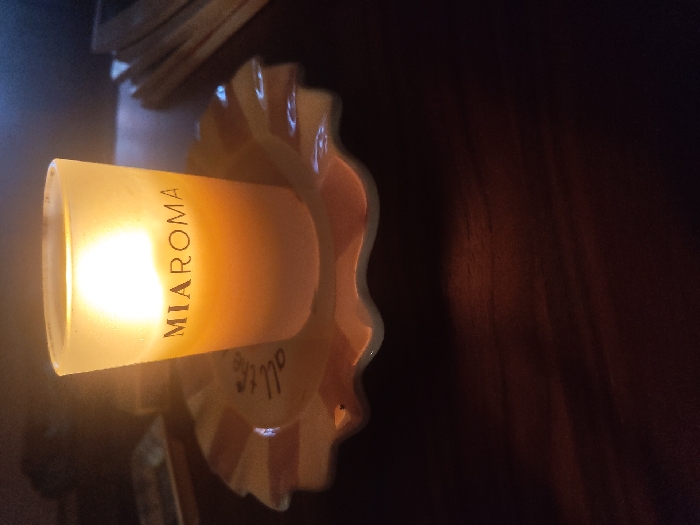 - "A lit candle with "MIAROMA" printed vertically on its frosted glass container sits in a ruffled, patterned candle holder" by FM-yd5Sl1, licensed under CC BY 4.0