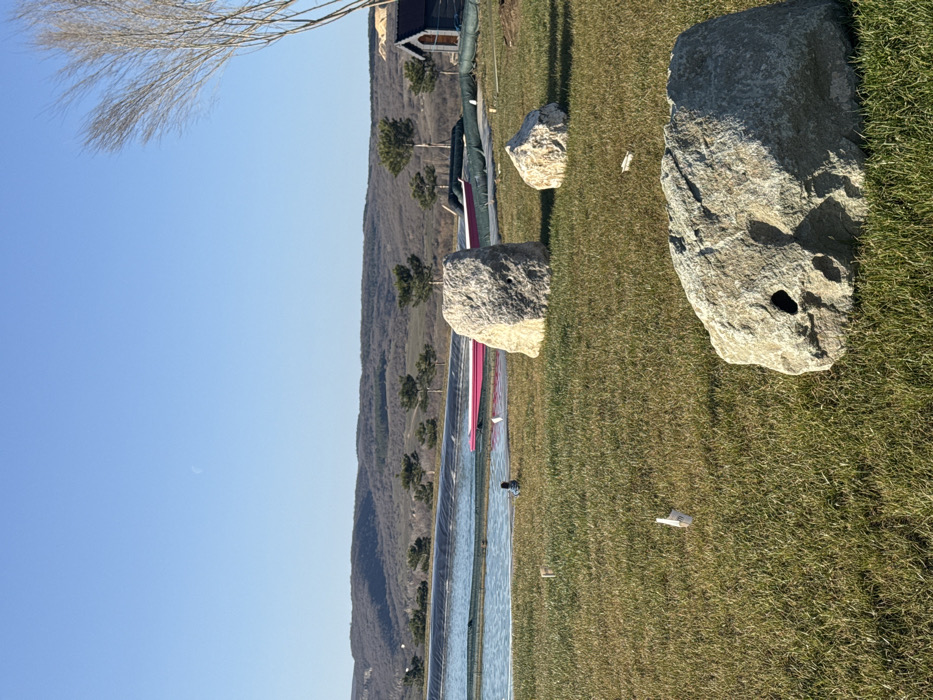 The image depicts an outdoor scene in Зеленогорское сельское поселение, Ukraine, under a clear blue sky with a visible crescent moon in the upper center. A large, artificial pond or reservoir, lined with black plastic sheeting, dominates the mid-ground. On the far side of the pond, two pink objects, appearing to be paddleboards or small boats, are partially visible, one possibly in the water, the other on the bank. A dark bird is present in the water near the pink objects. Beyond the pond, a row of small, conical evergreen trees is evenly spaced, leading to a distant range of hills covered in sparse, brownish-gray vegetation. In the foreground, a manicured lawn of short, yellowish-green grass contains three irregularly shaped, light-colored boulders. The largest boulder is in the lower right, featuring a distinct dark cavity. A medium-sized boulder is positioned further back, and a smaller one is slightly to its left. Two light-colored birds are standing on the grass near the pond's edge. Several small pieces of white debris, consistent with crumpled paper or plastic, are scattered across the grass. To the far right, a small, dark wooden structure with a peaked roof, resembling a shed, is visible, alongside green tarpaulins or covers on the ground. A bare deciduous tree with fine branches is partially cropped on the far right edge of the frame. The scene is static, with no discernible human presence or activity.