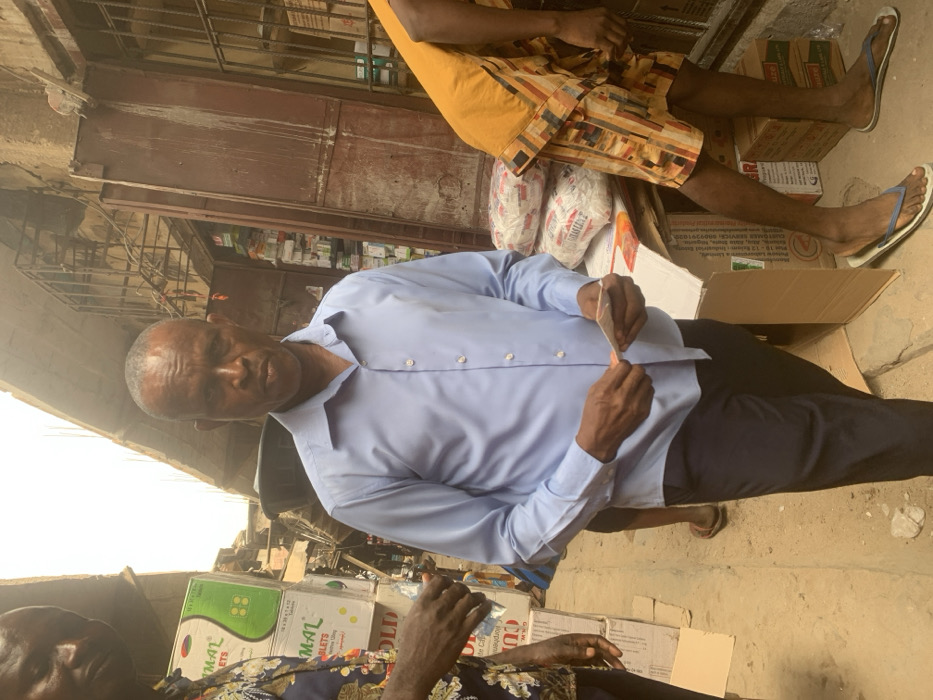 An image captures three individuals in an outdoor setting, likely a marketplace. One man, dressed in a light blue shirt and dark pants, is positioned in the foreground, holding a small item. Another man, seated behind him, wears a patterned yellow shirt. A third person is partially visible at the bottom, wearing a printed top. Stacks of boxes, labeled with brand names like "MAL" and "COLD," surround them. Overhead, metal structures and shelves filled with various goods are visible, suggesting a commercial environment.