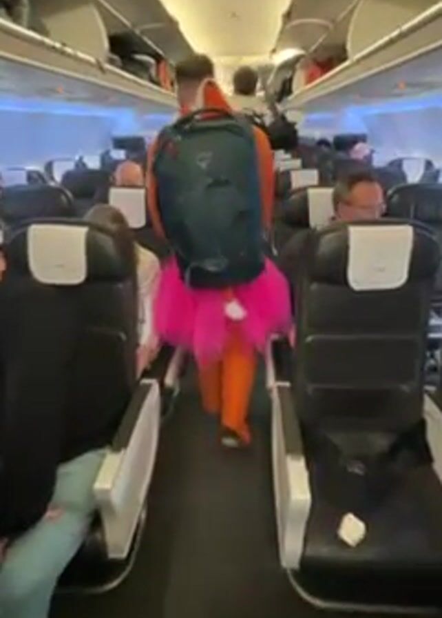 Inside an airplane, a man walks down the aisle toward the front of the plane. He wears an orange jumpsuit, a pink tutu, and a large gray backpack. Passengers are seated in the rows of seats on either side of the aisle. Most are facing forward. Many are in dark clothing. The cabin's overhead storage is visible. The plane appears to be mostly full.