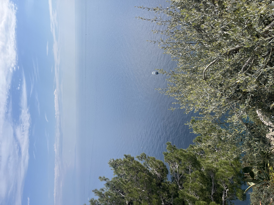 The image displays a high-angle, expansive view of the Tyrrhenian Sea from a vegetated cliffside in Positano, Italy. The upper two-thirds of the frame are dominated by the sea, which appears calm and deep blue, transitioning to a lighter blue towards the distant horizon. Above the horizon, a pale blue sky features scattered white stratocumulus clouds. In the mid-right section of the water, a single white motorboat with a dark-colored lower hull is visible, stationary on the surface. Faint wake lines or distant boat trails are discernible further out in the sea towards the left and center. The foreground is occupied by dense, green Mediterranean vegetation. On the left, a portion of a conifer tree, characterized by dark green needles and visible branches, extends into the frame. On the right, a multi-branched shrub with silvery-green, elongated leaves is prominent. Below the conifer on the lower left, additional smaller plants, including what appears to be a succulent or cactus, are visible. No human figures or active interactions are present in the scene.