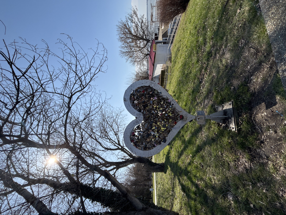 - "A prominent white, heart-shaped metal sculpture, densely packed with various small padlocks, stands centrally on a grassy slope in a park area of Silistra, Bulgaria" by FM-vNO8t2, licensed under CC BY 4.0