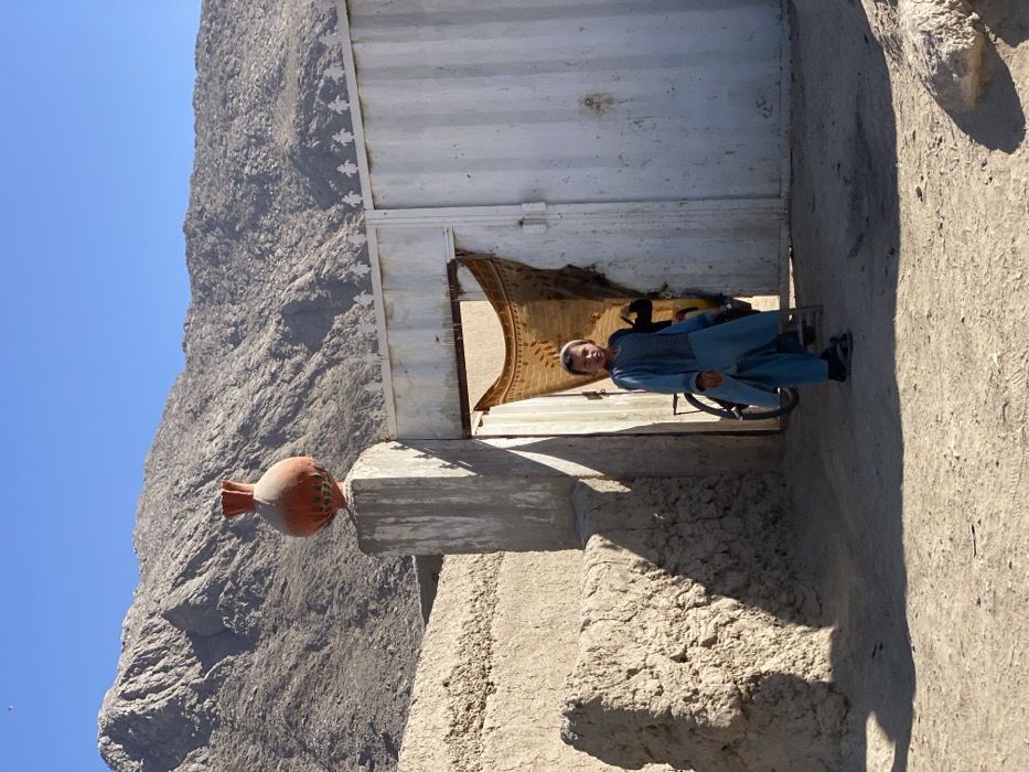 The image depicts an outdoor scene in an arid, mountainous environment under a clear blue sky. In the foreground, dry, light-brown earth shows distinct shadows. To the left, an eroded mud-brick wall occupies the midground. Adjacent to it, a concrete pillar stands, topped with a reddish-brown, spherical pottery urn featuring a fluted neck and base. To the right of the pillar, a light-colored metal gate, possibly corrugated, is partially open, revealing a shadowed doorway draped with a patterned, yellowish-brown fabric curtain. Decorative finials line the top edge of the gate. A young individual, appearing to be a boy, stands centrally in the midground, facing the camera. He wears a light blue traditional tunic and trousers with darker blue patterns, and black open-toed sandals. His expression is neutral as he looks directly forward. Behind him, partially obscured by his left side and within the shadows of the doorway, a dark-colored bicycle is visible, along with an indistinct, partially obscured figure deeper in the shadows. The background is dominated by large, rugged, grey-brown mountains. Strong sunlight illuminates the scene, creating sharp, angular shadows.