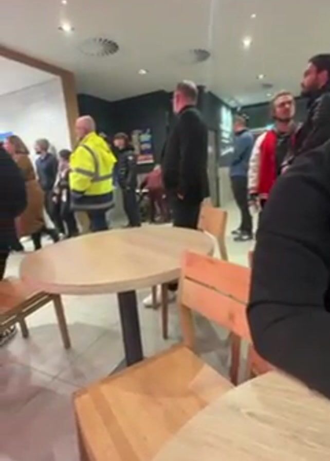 interior of a busy fast food restaurant, possibly a McDonald's. Several people are standing around, some seemingly waiting in a line. There is a man in a yellow reflective vest, another in a black suit, and several others in casual winter attire. The camera is positioned from a seated perspective at a small, round wooden table with matching chairs. Part of a person is visible in the lower right, wearing a black hooded jacket and dark pants, with light-colored shoes resting on the floor. The restaurant has a tiled floor, and the lighting appears to be bright. The scene seems somewhat crowded, with people moving around and waiting.
