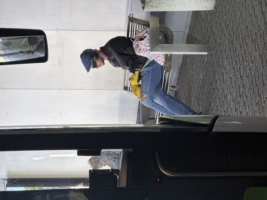 The image depicts an urban street scene in the city of Poznan, Poland, captured from within a vehicle, likely a bus or tram. The left side of the frame is dominated by a dark vertical pillar and a curved metal bar, part of the vehicle's interior. Outside, a male individual is seated on a modern, metallic slatted bench. He is facing to the right, wearing a blue flat cap, dark wrap-around sunglasses, and black over-ear headphones. His attire consists of a pink collared shirt visible beneath a dark jacket, and blue ripped jeans. A bright yellow object, possibly a garment or wrapped item, rests on his lap. To his right, on the bench, is a pink and white patterned tote bag. The ground is paved with cobblestones. A light-colored, paneled wall forms the background behind the bench. A grey, cylindrical structure, resembling a trash receptacle, is partially visible to the right of the bench. An external rearview mirror, positioned at the top right, reflects an indistinct outdoor view. A reflection on the vehicle's left-side window reveals a second individual with light, curly hair, situated inside the viewing vehicle and appearing to look downwards.