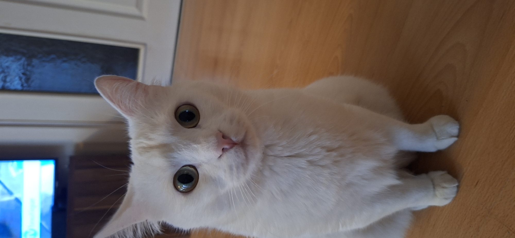 - "A white domestic cat with short fur, prominent green eyes, and a pink nose is centrally positioned, sitting upright on a light-brown polished wooden floor" by FM-OoACw1, licensed under CC BY 4.0