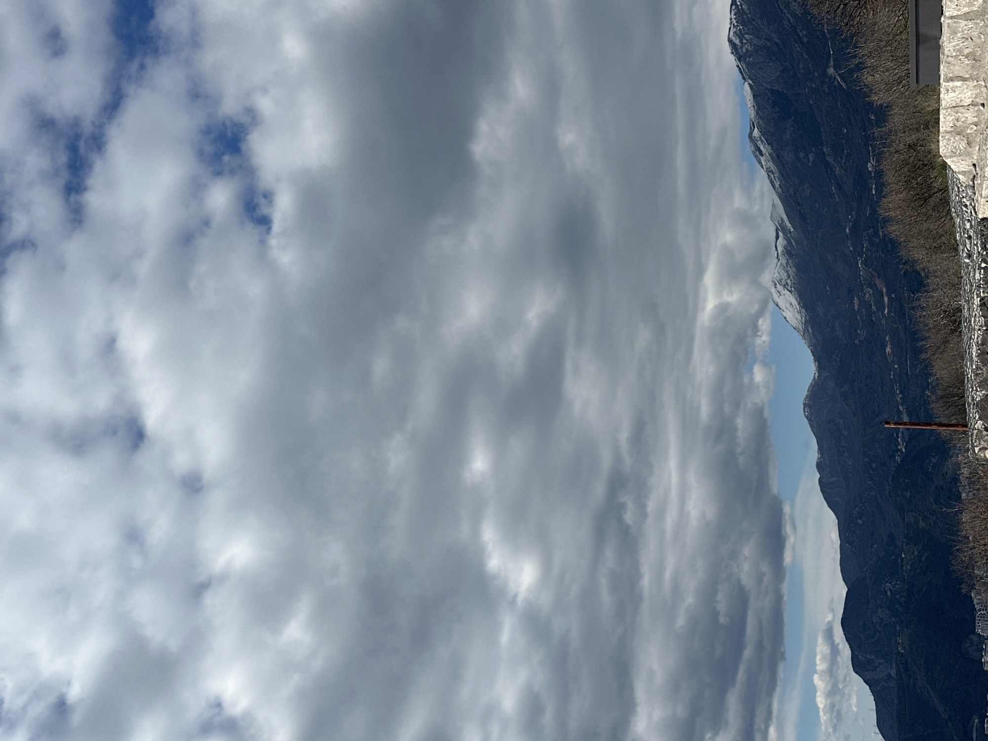 The image depicts a cloudy sky over a mountainous landscape. The right side of the image features a steep, dark mountain range. A concrete structure or wall is visible along the edge. The sky is filled with thick, gray clouds interspersed with patches of blue. A metallic bar protrudes vertically from the ground in the middle of the mountain, near the edge of the image. The location is identified as Čelobrdo, Montenegro.