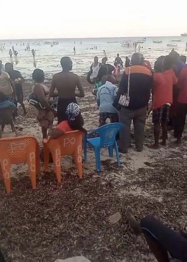 The scene shows a group of people gathered on a sandy beach. In the background, people are enjoying the water, with boats visible in the distance. Closer to the foreground, there are several people standing and talking. A woman is sitting on an orange plastic chair, resting her head on the back. There are two other plastic chairs nearby, one orange and one blue. The ground is covered with seaweed. Some of the individuals are wearing swimwear or casual clothing. The atmosphere appears relaxed and social.