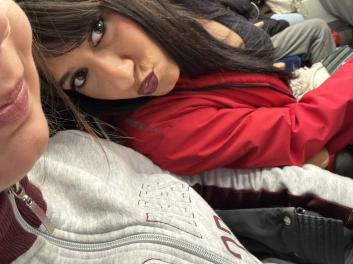 Two women pose closely for a selfie. One is partially visible, only her lips are in frame. The other gazes at the camera with dark eyes and pursed lips. She wears dark hair with bangs and a red jacket. They appear seated, likely on a mode of transportation, surrounded by other people and luggage. The first woman wears a gray jacket with a visible zipper.
