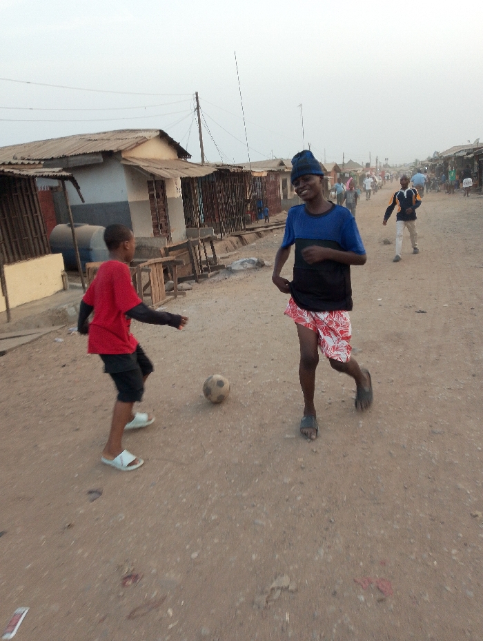 - "Two boys play soccer in a dusty street flanked by dilapidated, tin-roofed buildings" by FM-JRKle2, licensed under CC BY 4.0
