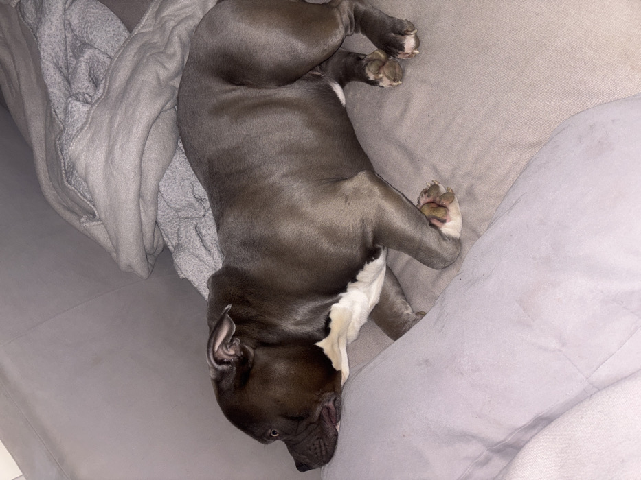 - "The image displays a blue-gray pit bull-type dog resting on a light-colored upholstered surface, likely a sofa or bed, located in Jarny, France" by FM-rEJ0w2, licensed under CC BY 4.0