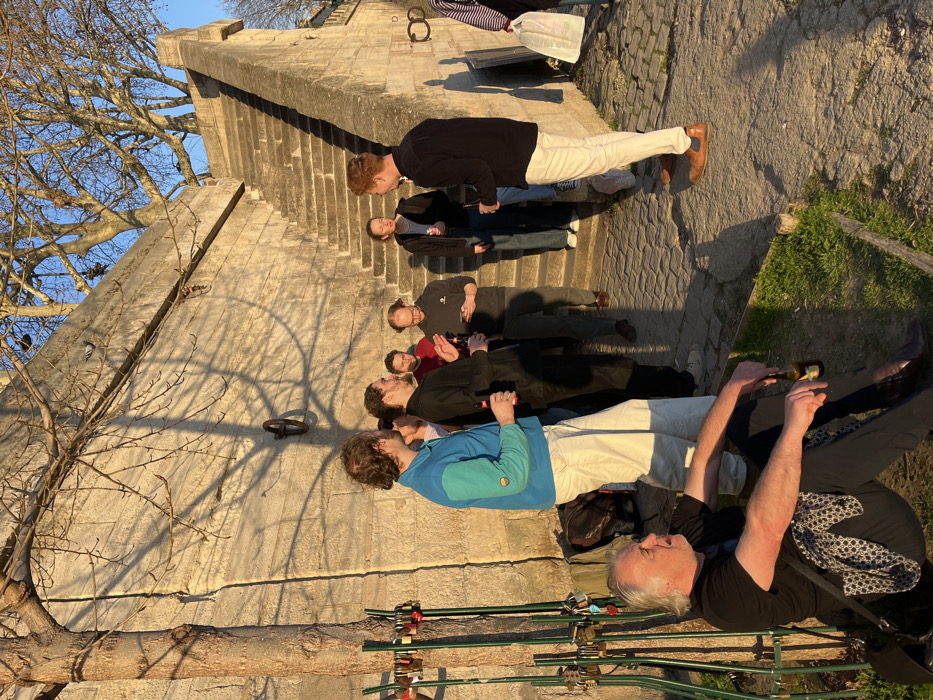 The image displays a group of approximately ten individuals gathered on the lower bank of the Seine River in Paris, France, illuminated by late afternoon or early evening sunlight casting long shadows