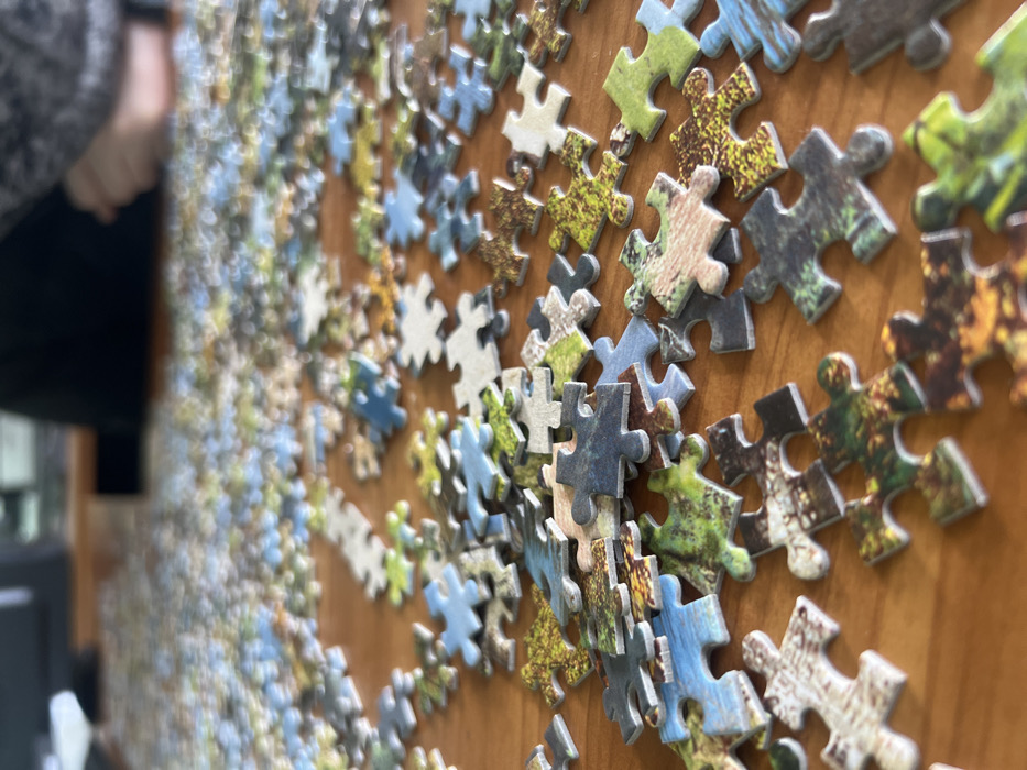 - "An indoor scene in Cherven Bryag, Bulgaria, displays a large quantity of jigsaw puzzle pieces scattered across a polished, light-brown wooden table surface" by FM-u4rC12, licensed under CC BY 4.0