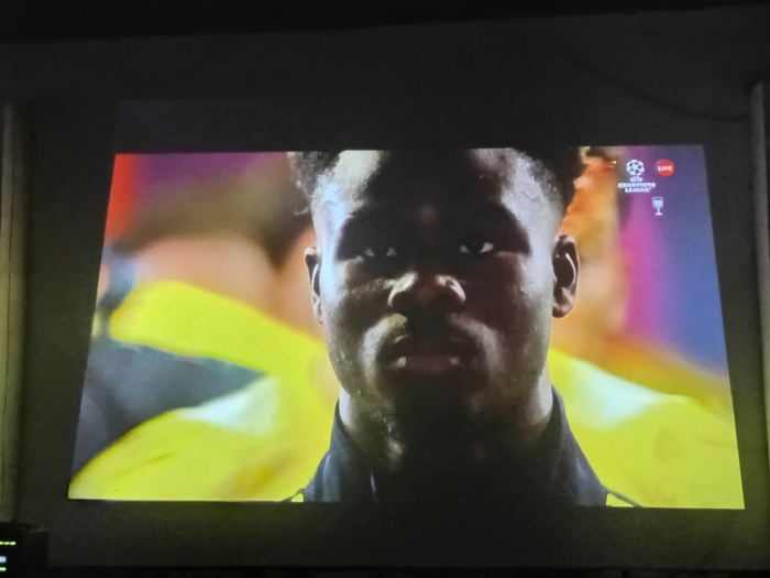 The image displays a projected video feed on a screen within a darkened room in Dabawa, Nigeria. The primary subject on the screen is a young adult male with dark skin and short, dark, textured hair, depicted in a close-up from the chest up, looking directly forward with a serious, focused expression. He is wearing a dark-colored athletic top. The blurred background of the video shows indistinct yellow and reddish-purple elements, suggesting a stadium or event environment. In the upper right corner of the projected image, a "LIVE" indicator, the UEFA Champions League logo (a football with stars), and a small trophy icon are visible. The projection occupies most of the frame, with narrow dark borders of the screen or wall visible along the top, bottom, and sides, indicating the ambient room is dimly lit.