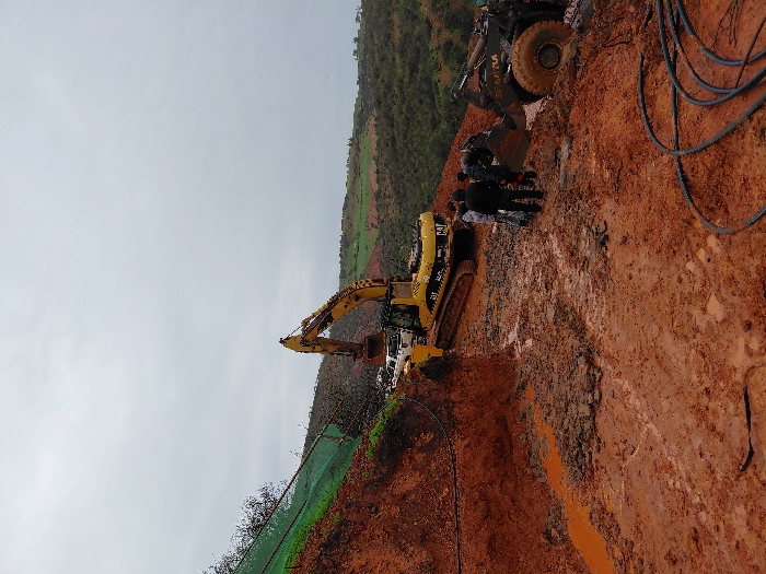 Heavy machinery operates on a muddy, red earth hillside. A yellow excavator digs into the slope near a safety net. Above, a large wheeled vehicle sits near a group of people. Wires snake along the ground. Green foliage is visible in the background under an overcast sky.