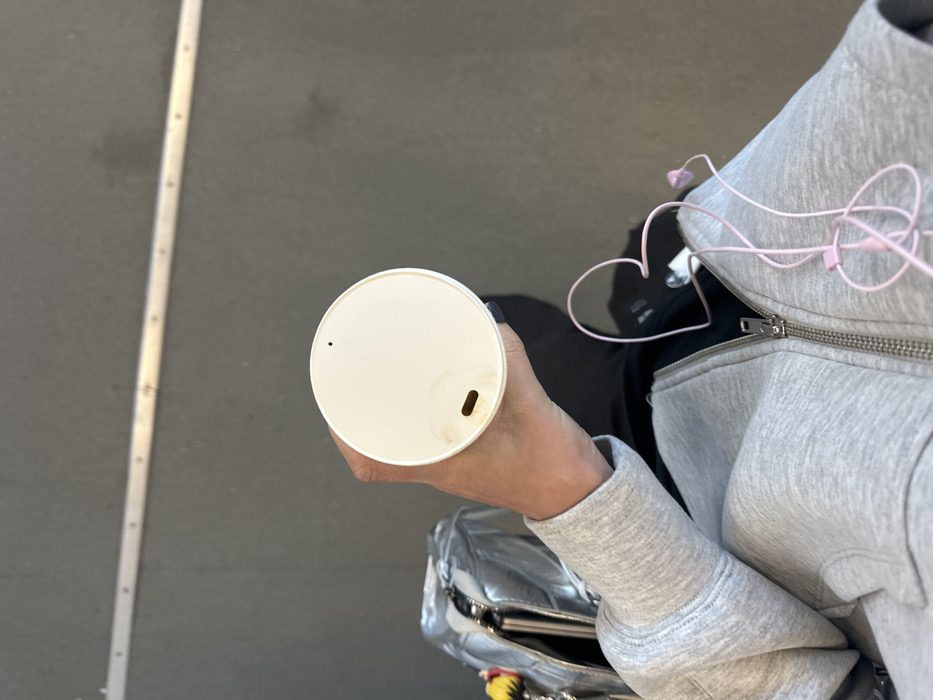 A first-person, downward-facing perspective captures an individual holding a white disposable cup with a lid in their right hand