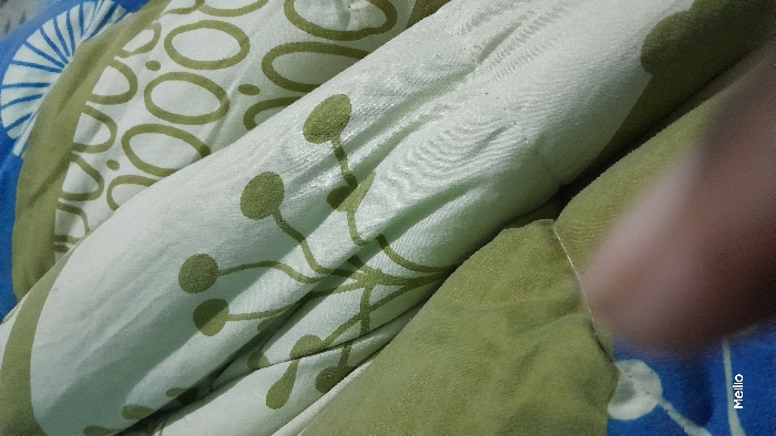 close-up of a patterned bed sheet in green and white, with a blue bed sheet partially visible in the bottom left corner. The sheet features a repeating pattern of stylized green flowers. The bed sheet is folded and the photo was taken from a low angle, capturing part of an arm in the lower right corner. The image was likely captured inside a home located in Kapsabet, Kenya, based on the provided coordinates.