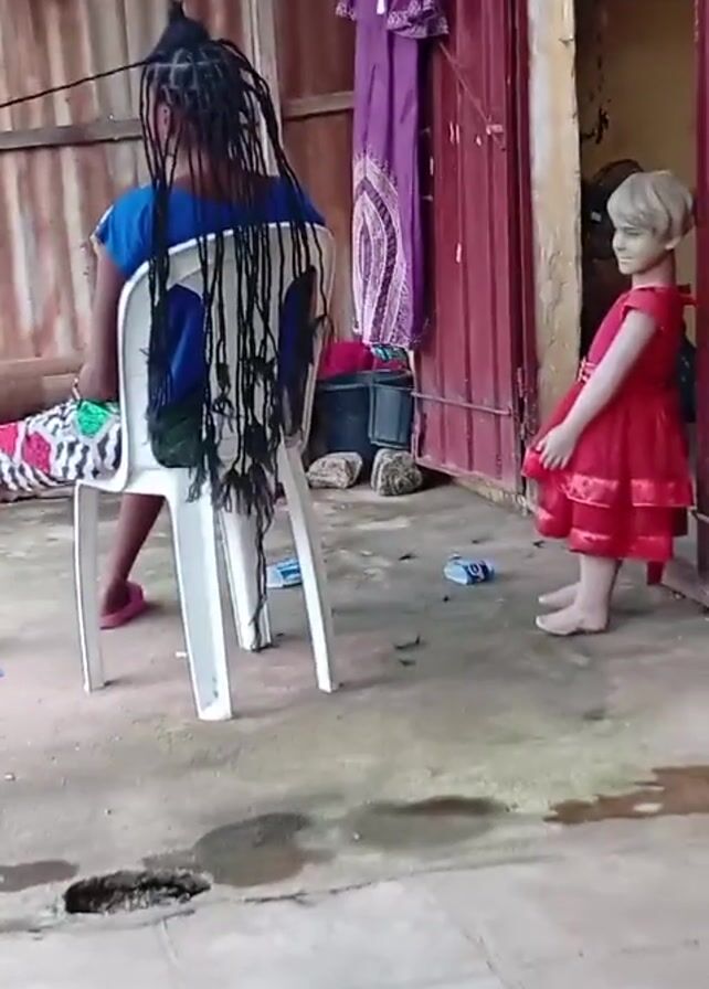A person with long braids sits on a white plastic chair, facing away from the camera. They are wearing a blue shirt and patterned shorts. A mannequin in a red dress stands nearby, partially obscured by a red door. A purple dress hangs above the door. The area appears to be an outdoor space with a corrugated metal wall in the background. There are puddles and debris on the concrete floor. There's also a pair of sandals near the bottom left of the frame.