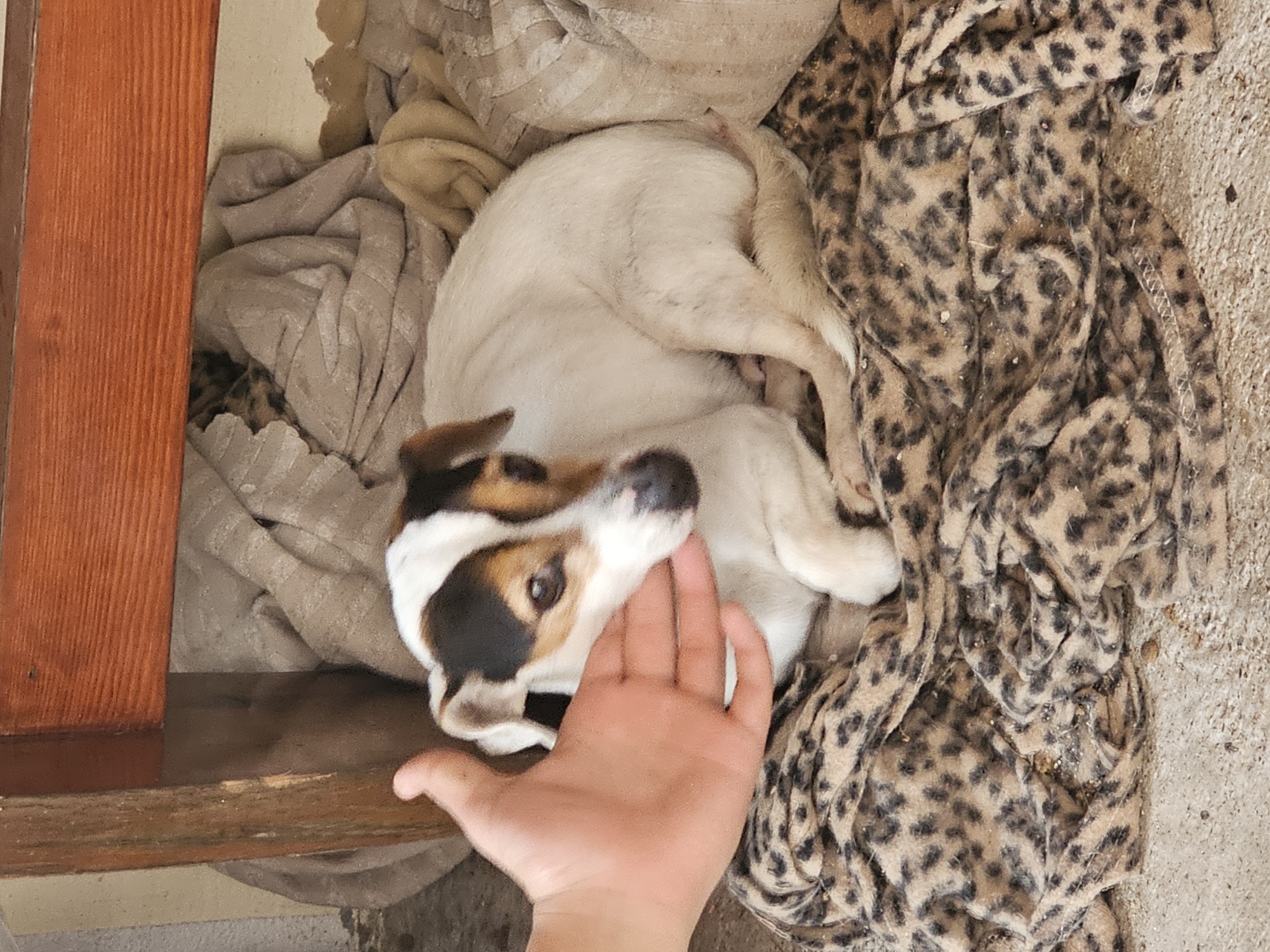 A medium-sized dog, primarily white with distinct black and tan markings on its head and ears, is depicted resting on a crumpled tan and black leopard-print blanket. The dog is curled, facing slightly left, with its brown eyes directed towards the viewer. A light-skinned human hand is positioned on the dog's left cheek and neck, appearing to stroke or comfort the animal. The dog and blankets are situated on a concrete floor surface. Above and to the left of the dog, a distressed light-brown wooden vertical support is visible, along with an overlying reddish-brown horizontal wooden beam. A light-colored wall, exhibiting minor discoloration or wear at its base, forms the background behind the dog and additional light-colored blankets. The scene is located in Parvomay, Bulgaria.