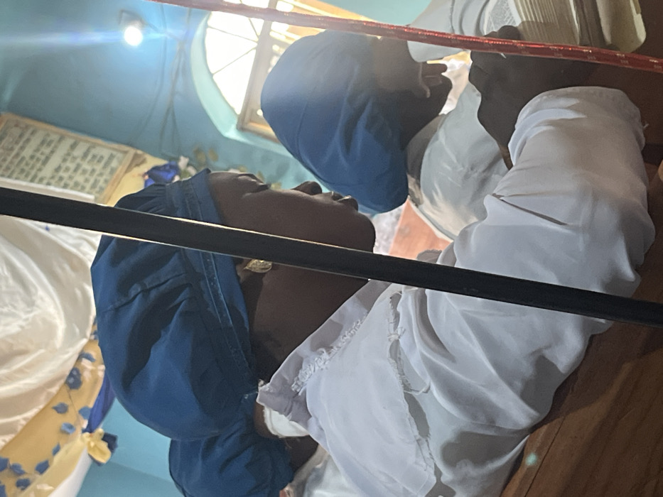 An indoor scene in Kuru Dungus, Nigeria, depicts at least two individuals, likely women, seated and focused downwards