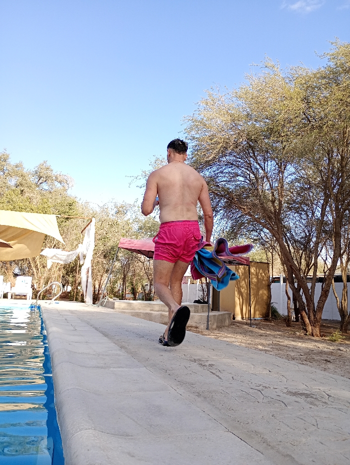 - "A shirtless man in pink shorts and black sandals walks away from a pool" by FM-skUe82, licensed under CC BY 4.0
