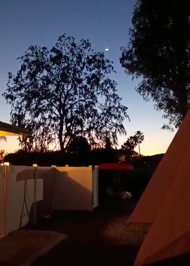twilight scene with a crescent moon in the sky. In the foreground, there are silhouettes of trees, a white fence, and a portion of what appears to be a canvas tent structure. Behind the fence, a red umbrella can be seen, suggesting an outdoor seating area. The sky transitions from a dark blue to an orange glow on the horizon. The camera slowly tilts upwards to give a better view of the moon.