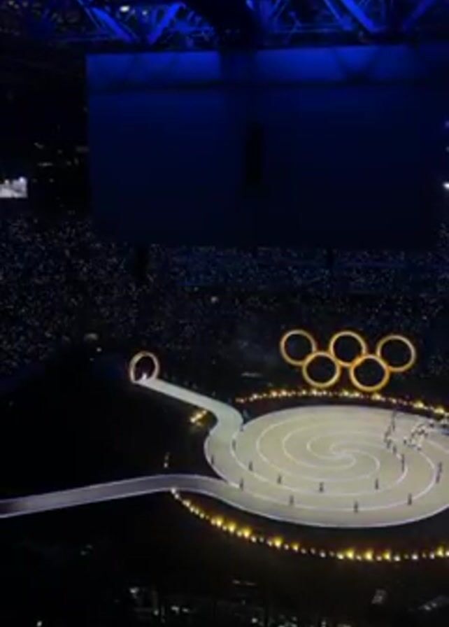 An overhead wide shot depicts the stage of an event with a spiral walkway lined with lights, culminating in a set of Olympic rings