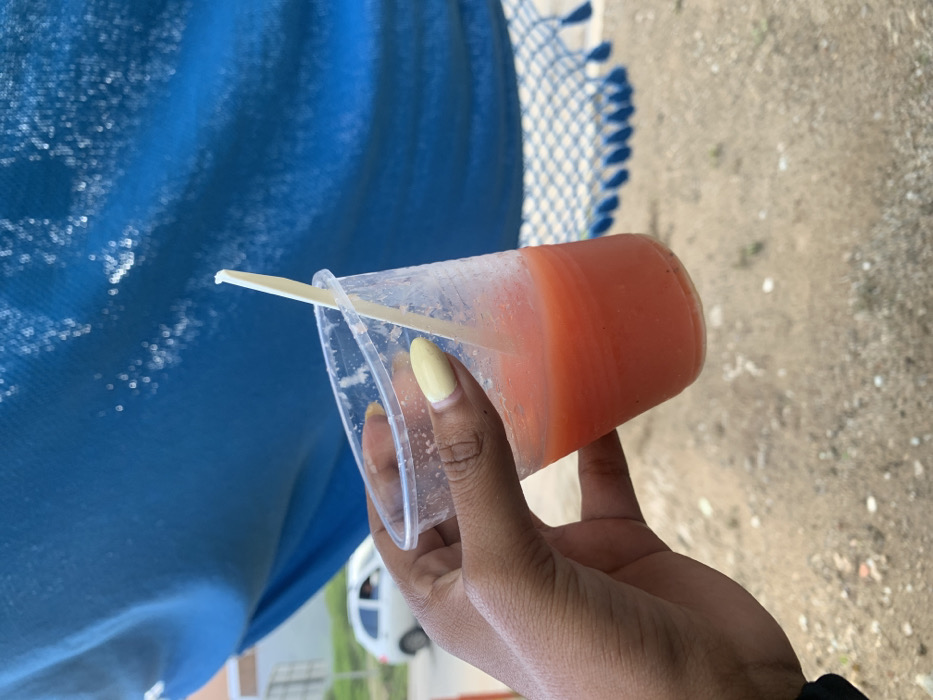 A person holds a clear plastic cup filled with orange liquid, likely a juice or smoothie. A light-colored stick or straw rests inside the cup. The hand has painted light yellow fingernails. In the background, a blue fabric with white accents is visible, along with blurry glimpses of a vehicle and landscape. The setting appears to be outdoors.