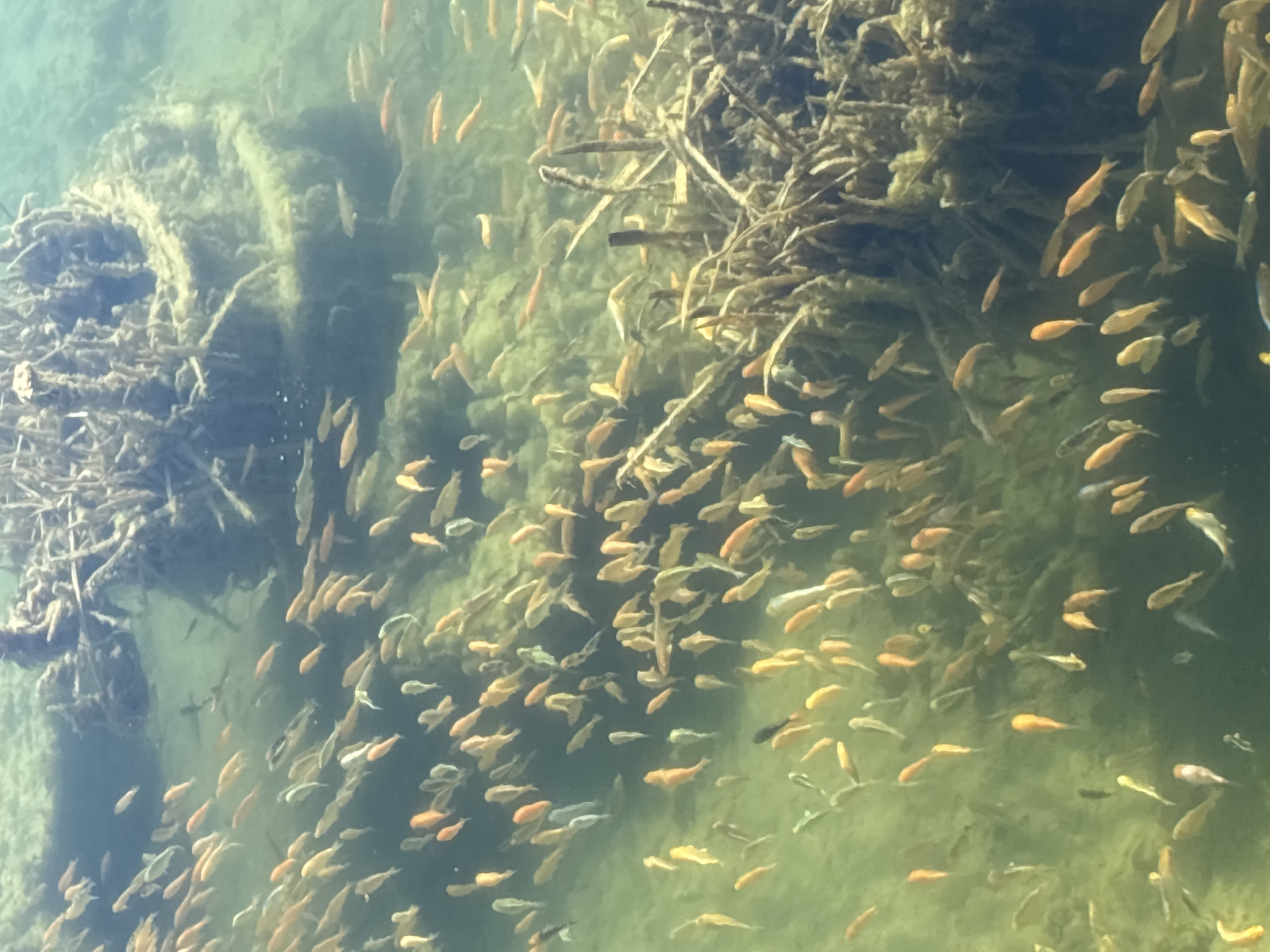 - "The image displays a dense aggregation of small to medium-sized fish, primarily orange-gold in coloration, with some lighter or silvery individuals, swimming in clear to moderately turbid greenish-brown water" by FM-UOwZk1, licensed under CC BY 4.0