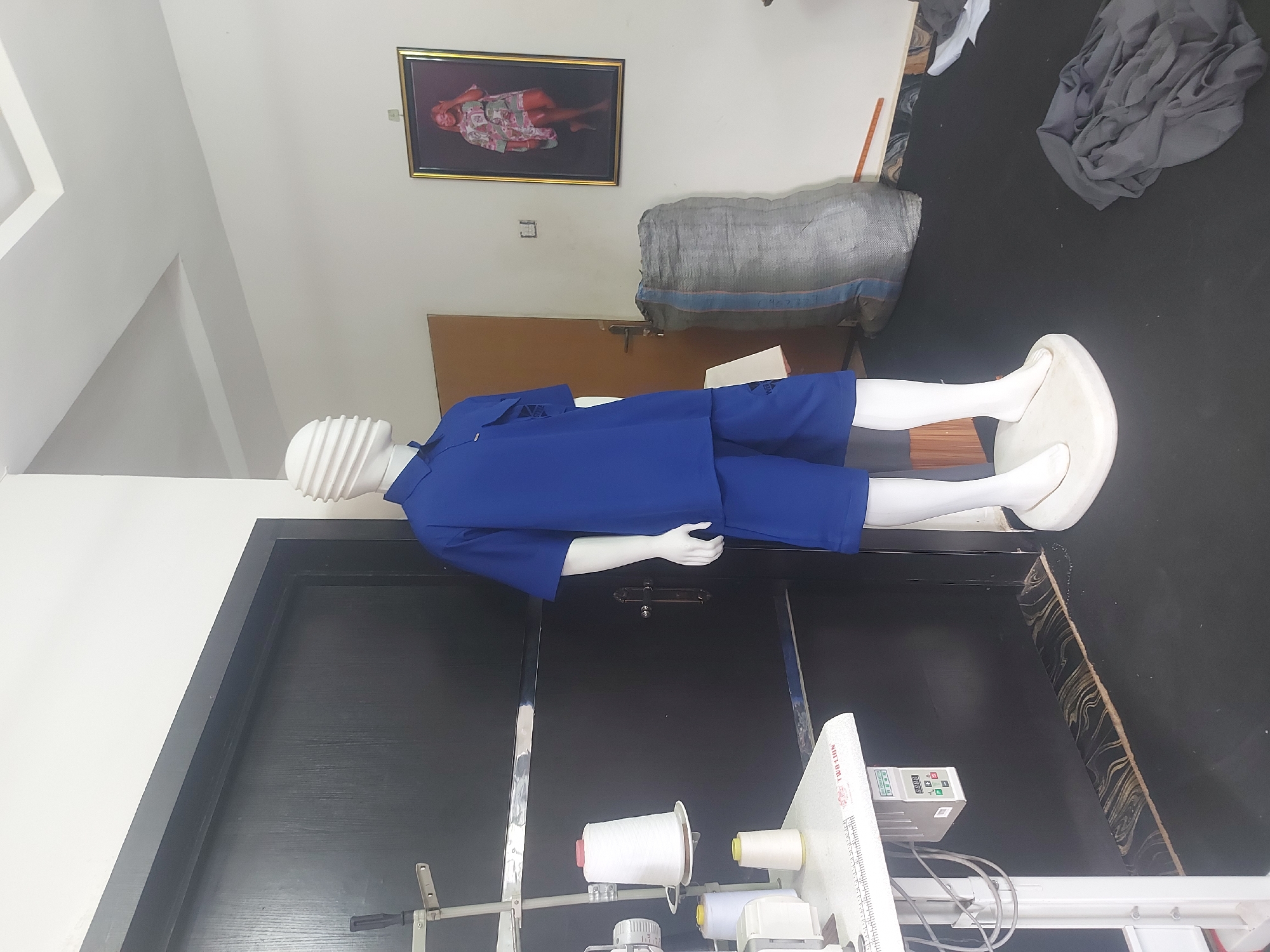 This image, taken in Alor, Nigeria, depicts an indoor commercial or workshop space. A white, headless mannequin with a horizontally ridged neck stands centrally, wearing a royal blue short-sleeved collared shirt with a breast pocket and matching shorts. The mannequin rests on a white oval base. To the left, a white industrial sewing machine table is visible, equipped with a sewing machine and spools of white and yellow thread. An electronic control panel with a digital display showing "88.8" and "AMP POWER METER" is mounted beneath the table. Behind the sewing machine and extending to the left is a closed dark wood door with a metallic handle, featuring a horizontal reflective silver strip. In the background, behind the mannequin and to the right, a lighter brown wooden door is partially visible. A large, grey woven sack, possibly containing materials, leans against the right wall. Above the sack, a framed portrait of a woman in a patterned dress hangs on the white wall. The ceiling is white with recessed rectangular panels. The floor is dark-colored, and a crumpled pile of dark grey fabric lies on the floor to the right of the mannequin.