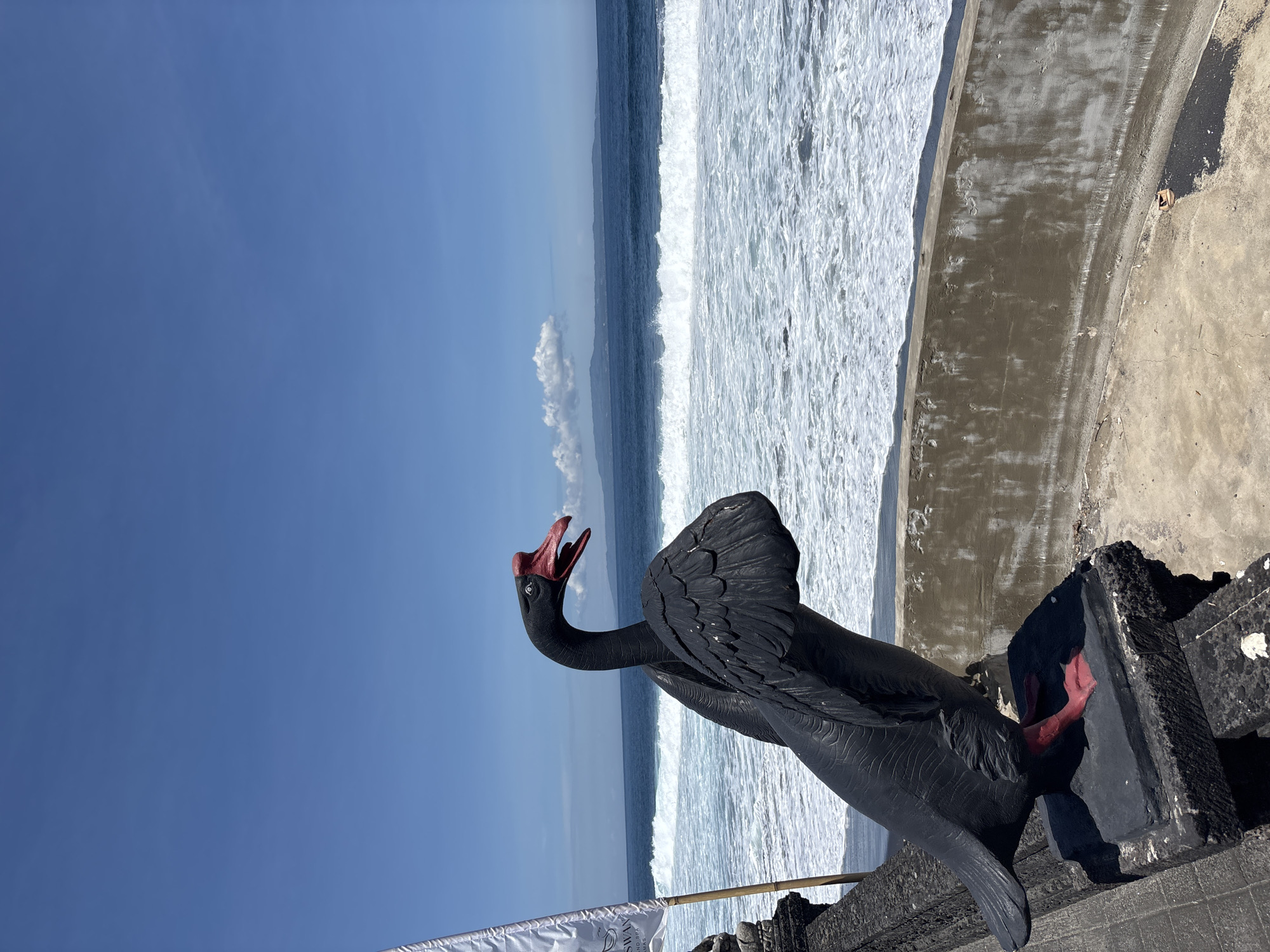 The image captures a black swan statue positioned on what appears to be a ledge or wall, set against a backdrop of the ocean
