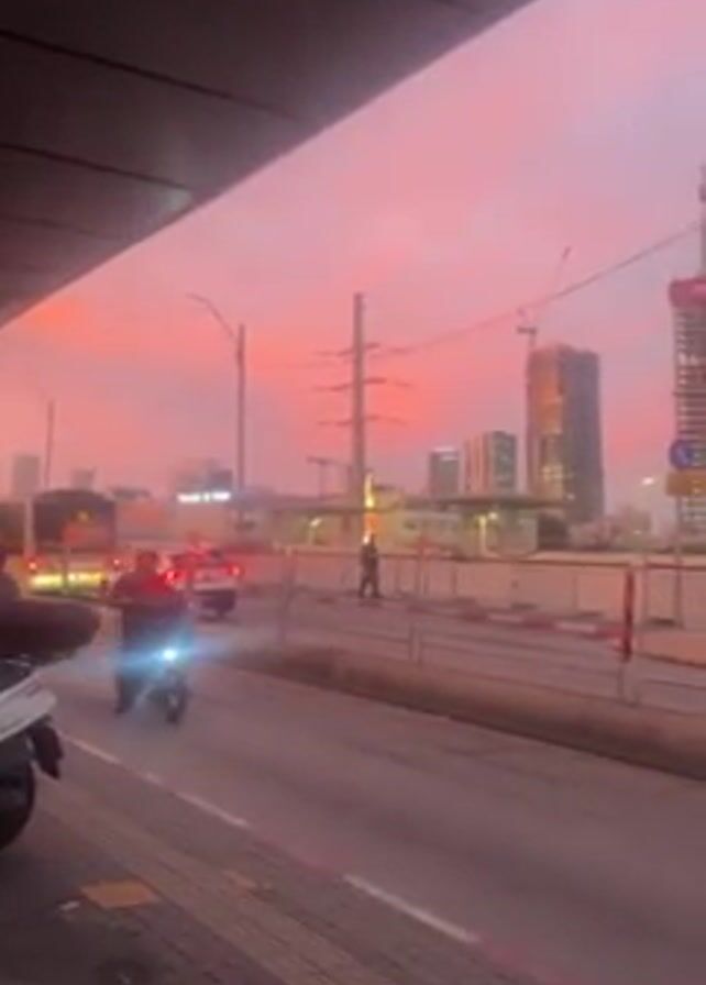 city street at dawn or dusk under a pink sky. The camera is positioned under a covered area, possibly a bus stop. A road with traffic passes in front of the viewer. A motorcyclist passes on the road. In the background are buildings, including skyscrapers under construction and finished buildings. The video pans slightly to show more of the city skyline and the changing sky. The video ends showing buildings in the distance behind a barrier.