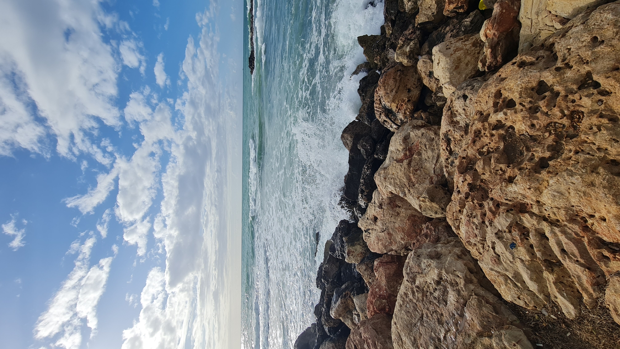 - "coastal scene in Nahariyya, Israel, featuring a rocky shoreline where waves are crashing against the rocks" by FM-1TRqb2, licensed under CC BY 4.0