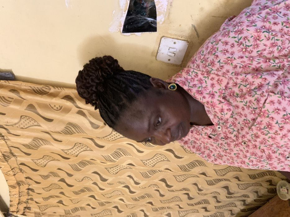The image depicts an adult female with dark skin, positioned indoors. Her hair is styled in micro braids pulled up into a high bun. She wears a light pink collared shirt featuring a repeating pattern of small pink flowers and green foliage. A green earring with a gold-colored border is visible on her right ear. She is observed in a slightly off-profile view, looking towards the left side of the frame. The background consists of a light yellow wall to the right of the subject. Mounted on this wall is a white rectangular light switch plate with two toggle switches. Below and to the right of the switch plate, a rectangular section of the wall shows missing plaster or paint, revealing a darker recess and rough white patching around its edges. To the left and behind the subject, a light brown curtain is visible, featuring a repeating pattern of dark wavy lines and dotted elements. The curtain is gathered at the top. The specific location within Jos, Nigeria, is not discernible from the provided visual information.