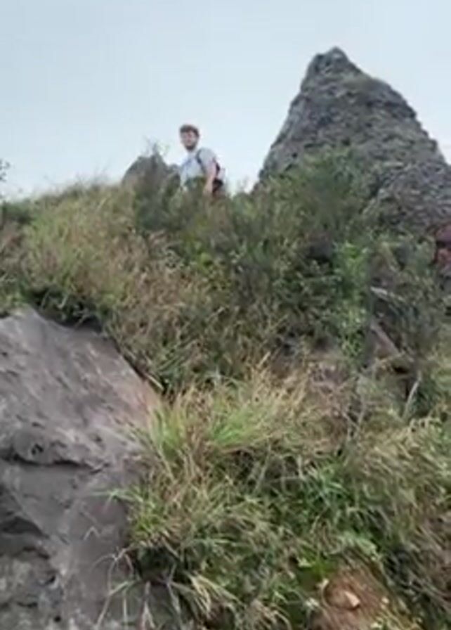 A man with a backpack stands on a rocky, grassy hillside on what appears to be a mountain. He is looking directly at the camera. The man takes a step towards the camera. In the background is a large, jagged, rock formation. The sky is overcast.