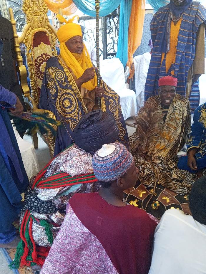 A group of men in traditional clothing. One man wears a yellow turban and a blue and gold robe. He sits in a gold throne and holds a staff. Another man with a red hat sits to the side in a patterned robe. Two people in maroon and blue patterned hats kneel in front. Drapes in blue, orange, and white hang in the background.