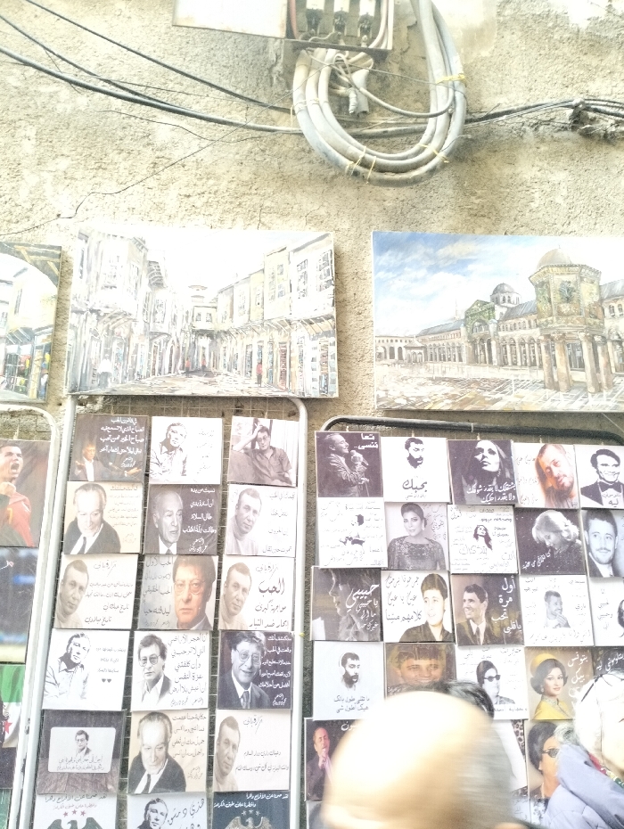 The image displays an outdoor scene in Damascus, Syria, likely within a market or street in the Old City, given the depictions of the Umayyad Mosque and traditional Damascene architecture. The upper section of the scene features a light-colored, textured concrete or stucco wall with visible cracks. Attached to this wall is an electrical infrastructure consisting of several bundled grey wires secured with ties, leading into a grey electrical box or conduit junction. Below the electrical components, two horizontal rectangular paintings are mounted against the wall. The painting on the left depicts a traditional narrow street or alleyway lined with multi-story buildings featuring arches and windows, rendered in a light, somewhat muted palette. The painting on the right illustrates a wide exterior view of the Umayyad Mosque, showcasing its classical architecture, including domes, arcades, and a large courtyard, under a blue sky with scattered clouds. Beneath these paintings, a large, grid-like display of numerous smaller, square-shaped items is presented, likely on a metal rack. These items are predominantly printed portraits, possibly album covers or book jackets, featuring faces of various individuals. Many portraits are in monochrome or sepia tones, depicting what appear to be Arab public figures, musicians, or actors, often accompanied by Arabic text. A few images also include a prominent football player. In the lower right foreground, a blurred human head, viewed from behind, partially obscures the lower portion of the display, indicating an individual observing the items. A blurred shoulder and arm, with glasses, are visible just to the right of the head, suggesting the presence of additional people. The lighting suggests an outdoor, daylight setting.